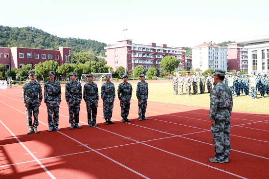 沈梁教官與同學們交流軍訓的意義,希望同學們在軍訓中不退縮、守紀律、懂服從,用心體驗每一個細節,出色完成本次軍訓任務。