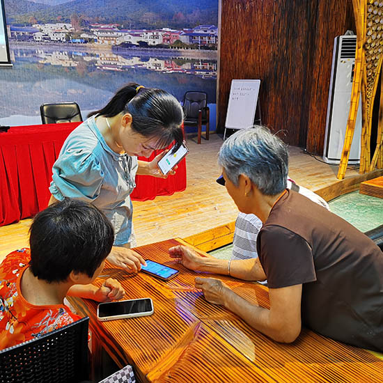 來自安吉縣技師學院的季艷茹老師通過“面對面、手把手”實操互動型教學的方式,給老人們演示了連接微信表情包、查找應用、下廚房美食、美圖秀秀、實時公交、網上購買高鐵票、網上預約掛號繳費等功能。老人們個個興趣高漲,圍著季老師要求“一對一”指導。季老師逐個步驟反復講解,直到老人完全掌握操作步驟。幫助老年人不與時代脫節,真正享受到數字化紅利。