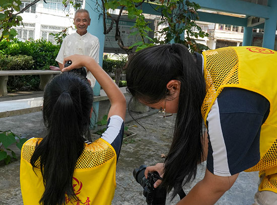 為了給老人們拍出優質的照片,數字影像技術專業的志愿者們攙扶著老人們來到環境較好的拍攝地點,親自示范,引導老人們擺造型。有的老人年齡大了,聽力不好,志愿者們就彎腰俯身,湊近老人的耳邊反復溝通,有時候,一句話要重復多次。遇到不會講普通話的老人,志愿者們就安排會說溫州話的同學進行溝通,整個拍攝過程其樂融融,輕松溫馨?;顒赢斕?,數字影像技術專業的同學們為村里的30多位老人拍攝了生活照和藝術照,還為90歲以上的老人拍攝了肖像照,得到了大家的一致肯定。