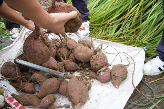 雨后的土地,帶有泥的厚重香。面對著一片番薯藤脈,同學們不知如何是好。聽了農民伯伯的講解,兩個男生用力扯藤脈的下端,一連串的番薯被藤脈帶出松軟的泥土,迎來旁邊女生的連連叫好。接下來女生上場,細心挖開泥土,露出一個個碩大的番薯,那是收獲的快感。