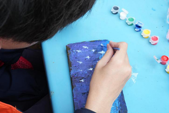 一片片古磚在手,沉淀的是歲月的痕跡。同學們都想在古磚上留下美好的畫作。留下的是寧靜的星空;是事事如意的柿子;是綠色、粉色的恐龍;是現場綠草地上的黑狗;是調皮的笑臉……不同的圖案反映不同的心境,歷史在同學們手下不斷延續,如此美好!