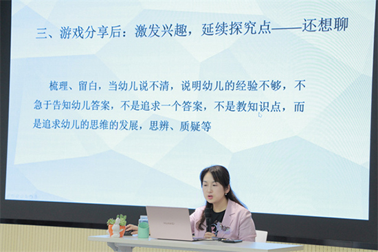 最后,莫老師帶來了《游戲精神下思維共享活動的探究與思考》專題講座。以“什么是思維”“什么是共享”“什么是思維共享活動”三個問題為大家詳細解讀了思維共享活動的概念和目的;同時通過對思維共享與集體教學活動的異同點、思維活動與談話活動的異同點進行解讀,用生動詳細的案例分析分享活動的現狀以及解讀教師對思維共享活動的困惑。