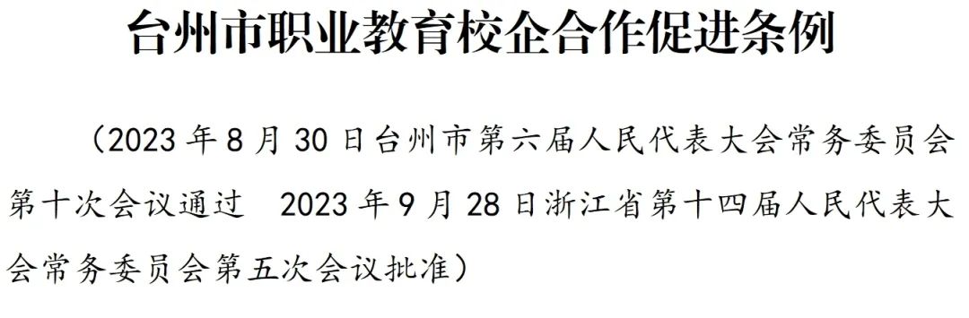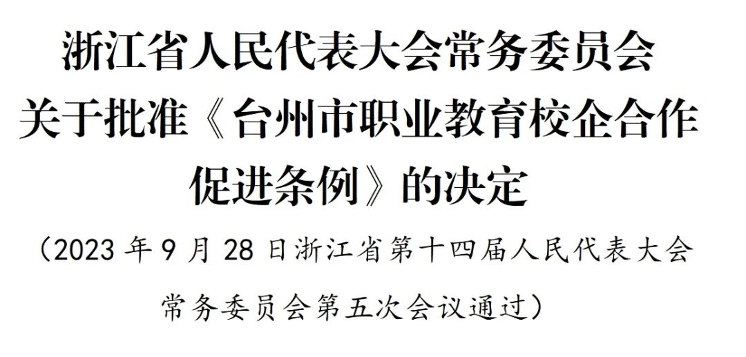 2023年8月30日臺(tái)州市第六屆人民代表大會(huì)常務(wù)委員會(huì)第十次會(huì)議審議通過的《臺(tái)州市職業(yè)教育校企合作促進(jìn)條例》,已于2023年9月28日經(jīng)浙江省第十四屆人民代表大會(huì)常務(wù)委員會(huì)第五次會(huì)議批準(zhǔn),現(xiàn)予公布,自2024年1月1日起施行。