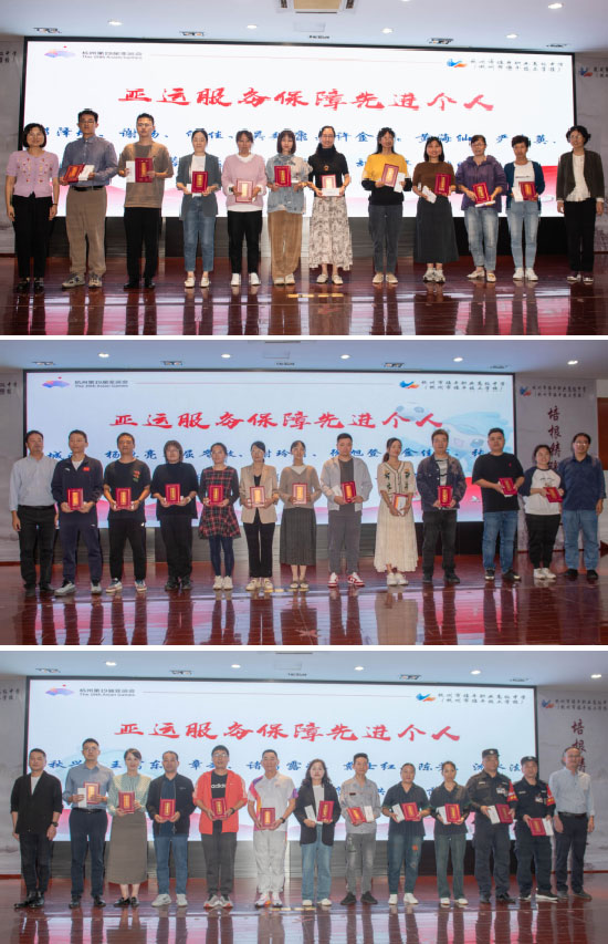 校領導為臨平職高亞運服務保障工作先進個人頒獎,并贈送亞運紀念品。