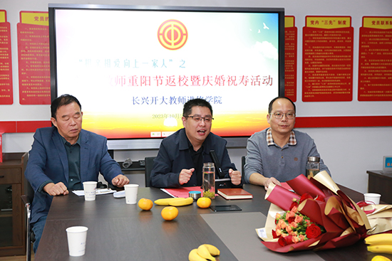 九九重陽 感恩敬老。為進一步做好退休教師關心關愛工作,提升退休教師的幸福感,10月20日,在重陽節來臨之際,長興開大教師進修學院全體退休教師歡聚一堂,舉行返校暨慶婚祝壽活動,本次活動由學院工會主席張傳學主持。
