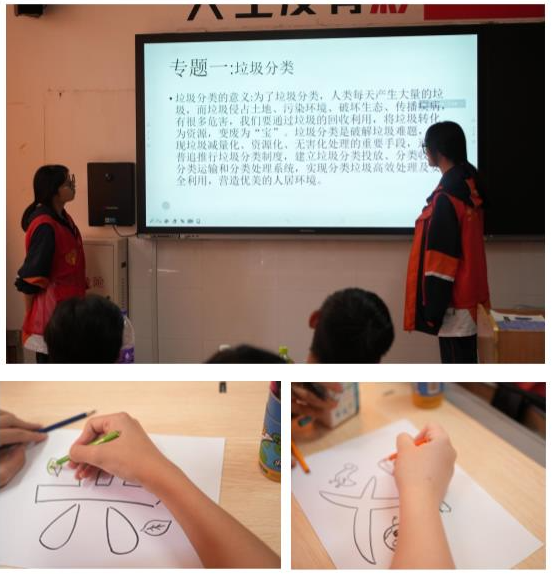 活動伊始,通過“文明校園”“垃圾分類”“光盤行動”三個篇章,讓大家深刻體會了建設美麗校園需要依靠大家的共同努力。接著,同學們通過雙手,繪制相關主題的字畫,同學們認真地勾勒出圖案,填充著五彩的顏色,并互相交流其中的收獲和感悟。