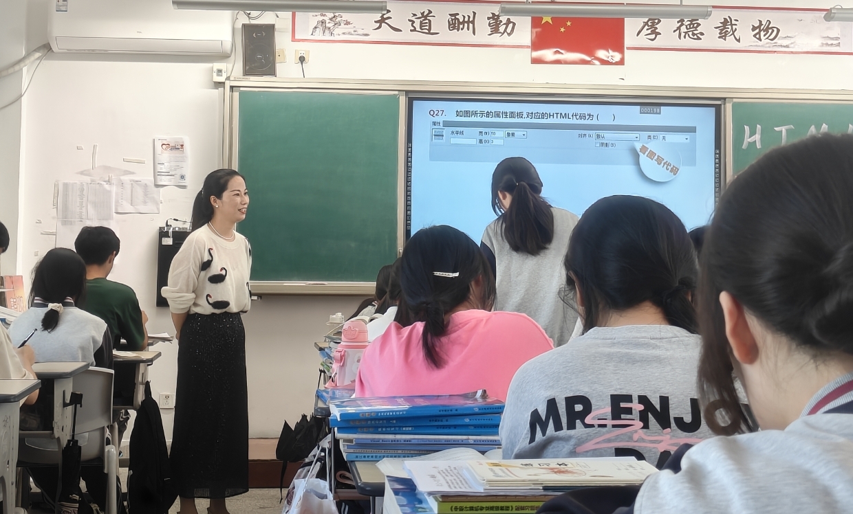 第三節(jié)課由鄭建美老師開的《HTML語言專題復習》。鄭老師通過讓學生完成答題,了解了他們對知識的掌握情況,并收集了他們的典型錯題。在課堂上,她利用小游戲調動學生的積極性,讓他們參與到復習中。她帶領學生復習了HTML的標記、屬性和書寫格式,利用生動的實例使學生更好地理解和記憶。