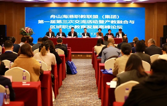 11月11日,舟山海港職教聯盟(集團)第一屆第三次交流活動暨產教融合與區域職業教育發展高峰論壇在舟山市定海新華僑飯店隆重開幕。舟山市職業教育與成人教育協會會長、浙江國際海運學院院長吳中平,舟山市人社局調研員邊雅麗,舟山市經信局副局長孫宇,省一流技師學院建設委員會專家陳昆昌,舟山海港聯盟(集團)理事長、學校黨委書記方軍,學校黨委副書記、校長許猛,學校黨委委員、副校長韓擁軍及兄弟學校專家領導出席活動。許猛致歡迎辭,活動由韓擁軍主持。企業代表、教師代表120人參加活動。