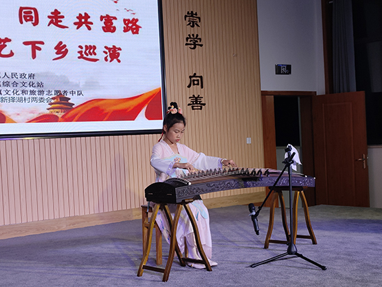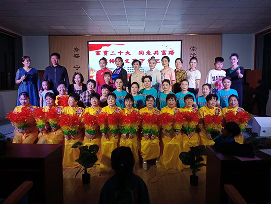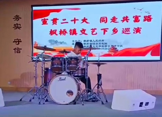11月3日晚,諸暨市楓橋鎮(zhèn)新?lián)窈宓奈幕Y堂內(nèi)人聲喧嘩,樂曲聲不斷。諸暨市楓橋鎮(zhèn)社區(qū)教育學(xué)校組織楓橋鎮(zhèn)楓之韻藝術(shù)團(tuán)演員為主的“楓橋鎮(zhèn)‘宣貫二十大,同走共富路’送戲下鄉(xiāng)文藝巡演”晚會正在演出。