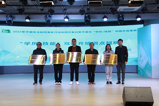 對(duì)浙江開(kāi)放大學(xué)平湖學(xué)院、衛(wèi)星能源公司、鐘埭成校、松楓社區(qū)、鄉(xiāng)村振興產(chǎn)業(yè)學(xué)院“學(xué)歷+技能”雙提升培訓(xùn)點(diǎn)進(jìn)行授牌。