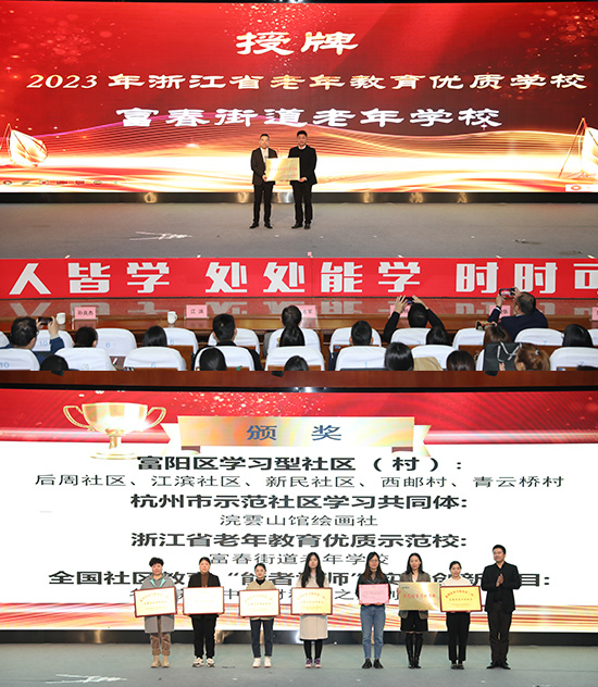 富陽(yáng)區(qū)職教中心校長(zhǎng)孫良杰為啟動(dòng)儀式致辭,并宣布全民終身學(xué)習(xí)活動(dòng)周啟動(dòng)!富陽(yáng)區(qū)老干部局副局長(zhǎng)江洪宣讀富春街道老年學(xué)校成功創(chuàng)建浙江省老年教育優(yōu)質(zhì)學(xué)校的批復(fù)文件并授牌。啟動(dòng)儀式上,對(duì)2023年獲得富春街道、富陽(yáng)區(qū)、杭州市各級(jí)各類獎(jiǎng)項(xiàng)的單位和個(gè)人進(jìn)行了表彰并頒獎(jiǎng)。其間,富春街道老年大學(xué)各社團(tuán)的成員們帶來(lái)了別開(kāi)生面的舞蹈、小合唱、太極拳、柔力球、旗袍秀等節(jié)目,將大會(huì)氣氛一次次推向高潮,展現(xiàn)了老年學(xué)員們平時(shí)豐富多彩的生活,彰顯了富春街道老年學(xué)校成功創(chuàng)建浙江省老年教育優(yōu)質(zhì)學(xué)校的實(shí)力。