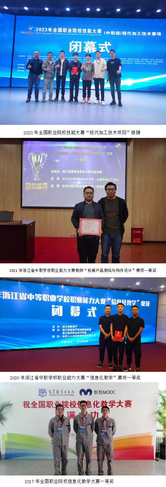 近三年,教師競(jìng)賽獲全國(guó)教師教學(xué)能力大賽一等獎(jiǎng)2項(xiàng),省職業(yè)能力大賽一等獎(jiǎng)3項(xiàng),省信息化教學(xué)項(xiàng)目一等獎(jiǎng)1項(xiàng)、二等獎(jiǎng)1項(xiàng),省教師“多彩課堂”評(píng)比一等獎(jiǎng)1項(xiàng)、二等獎(jiǎng)1項(xiàng)等;學(xué)生技能競(jìng)賽累計(jì)獲得全國(guó)教育部一類競(jìng)賽一等獎(jiǎng)4項(xiàng),二等獎(jiǎng)3項(xiàng),“現(xiàn)代加工技術(shù)項(xiàng)目”代表浙江省隊(duì)參加2023年全國(guó)職業(yè)院校技能大賽,獲得銀牌。(杭州市臨平職業(yè)高級(jí)中學(xué))