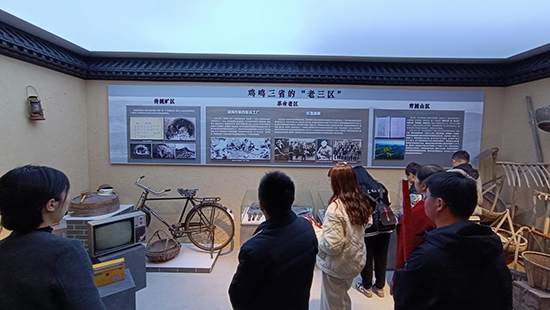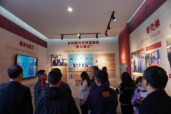 師生一行在新川村黨委委員張小強的引導下,先后參觀了鄉村振興案例館、誠信館、初心館、居家養老服務中心等,借助照片、數據、實物和音視頻等多種宣傳媒介手段,近距離感受到了新川村與天能“村企共建”的山鄉巨變。老照片里的新川村曾經高污染企業遍地開花,眼前的新川成為青山綠水富一方百姓的“世外桃源”。新川的美麗蛻變得益于村里果斷關停污染礦山,堅決淘汰落后產能,堅持走人與自然和諧共生的綠色發展之路,不斷提升綠水青山“顏值”,開掘金山銀山“價值”。這還得益于天能集團帶頭忠實踐行“綠水青山就是金山銀山”理念,通過“村企共建”,不僅讓新川村的綠水青山回來了,還讓村民的腰包“鼓起來”了。昔日的“苦瓜村”變成如今家家有別墅,戶戶有轎車的“富美村”。