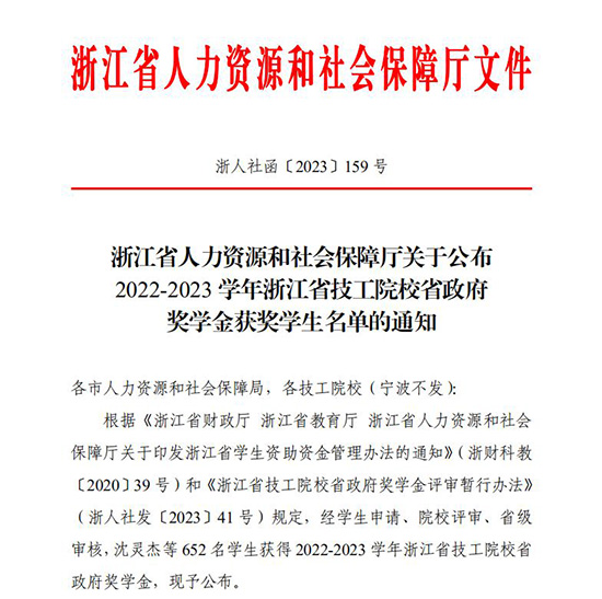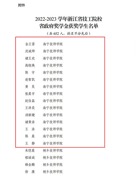 11月24日,浙江省人力資源和社會保障廳印發關于公布2022—2023學年浙江省技工院校省政府獎學金獲獎學生名單的通知,全省共有652名學生獲此殊榮,海寧技師學院共有15名學生上榜,每人獎勵6000元!