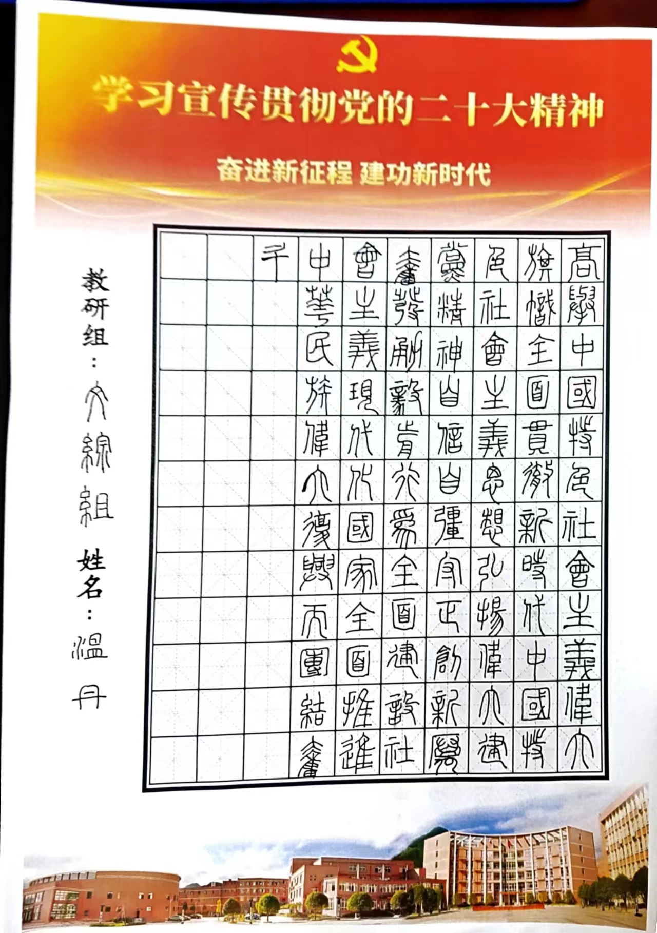 最是書香能致遠,筆墨丹香展英姿。為學習宣傳貫徹黨的二十大精神,增強教師群體厚植愛黨、愛國、愛社會主義的情感,也為促進教師夯實教學基本功,提升書寫水平,培養規范書寫的習慣,11月下旬,慶元縣職業高級中學組織全校教師開展硬筆書法大賽,此次大賽,由學校統一命題,書寫內容為黨的二十大主題。