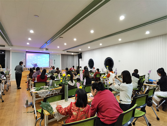 余文娟老師簡單介紹了中國傳統插花理論知識和技巧,然后一邊示范一邊指導學員著手插花。