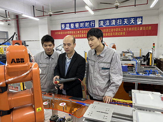 問起技能訓練的訣竅,宋海軍毫不掩飾:“一個字‘練’,熟能生巧,不練是不可能有進步的。”這一點,宋海軍最有發(fā)言權。此前,由他指導的諸暨技師學院代表隊分別在2019年、2020年、2021年、2022年連續(xù)榮獲“工業(yè)機器人技術”賽項的浙江省團體一等獎。最近,由浙江省教育廳主辦,浙江省教育廳職成教教研室、杭州科技職業(yè)技術學院承辦的2023年浙江省中高職一體化試點賽“工業(yè)機器人技術”項目比賽在杭州科技職業(yè)技術學院舉行,經過激烈角逐,代表諸暨技師學院出戰(zhàn)的祝龍祥、張一鳴、方衛(wèi)成在23支參賽隊伍中脫穎而出,勇奪比賽一等獎。對于這一系列成績,宋海軍把學校的支持擺在第一位,因為搞競賽離不開持續(xù)投入,現(xiàn)在工作室里擁有8臺工業(yè)機器人設備,這樣就有利于學生的梯隊建設。