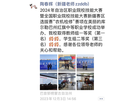 “沈老師,我們學校拿到了全國職業院校技能大賽新疆賽區選拔賽“農機檢修”賽項教師組一等獎,學生組二等獎!”12月2日,海寧市職業高級中學沈老師收到千里之外的新疆發來的好消息。作為農機檢修賽項的海寧職高國家級金牌教練、海寧市名師沈松良,深耕農機檢修賽項,結對阿克蘇地區老師,名師引領促進成長,通過線上線下相結合的方式,幫助他們在技能比賽中取得一等獎的好成績。