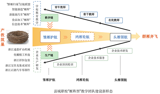 2021年以來,學(xué)校不斷聚焦地方產(chǎn)業(yè)特色,深化師資隊(duì)伍建設(shè),產(chǎn)教融合打造學(xué)校重點(diǎn)特色專業(yè)“雁陣型”創(chuàng)新團(tuán)隊(duì)建設(shè)。學(xué)校以機(jī)械專業(yè)高水平建設(shè)為契機(jī),發(fā)揮專業(yè)建設(shè)的示范引領(lǐng)作用,構(gòu)建基于思維轉(zhuǎn)型的產(chǎn)教融合新模式,深化機(jī)械、電子電工、烹飪專業(yè)的校企融合師資隊(duì)伍培養(yǎng)。聚焦縣域“以發(fā)展現(xiàn)代制造業(yè)為主,以優(yōu)化出口結(jié)構(gòu)為主,致力于發(fā)展高新技術(shù)產(chǎn)業(yè)”整體布局,優(yōu)化發(fā)展專業(yè)方向,打造支撐縣域經(jīng)濟(jì)發(fā)展與產(chǎn)業(yè)轉(zhuǎn)型的“產(chǎn)教之巢”。一是析標(biāo)準(zhǔn):構(gòu)筑“產(chǎn)教之巢”,以“課堂、課改與課題”為突破口,聯(lián)盟共同厘定“教學(xué)實(shí)施力、研究實(shí)踐力、研發(fā)實(shí)戰(zhàn)力”教師培養(yǎng)標(biāo)準(zhǔn),服務(wù)全周期成長孵化。二是優(yōu)路徑:“頭雁領(lǐng)航、鴻雁輪航、雛雁護(hù)航”三進(jìn)階教師培養(yǎng),創(chuàng)新企業(yè)專家駐校實(shí)現(xiàn)“歸雁伴航”,企校雙棲,形成雁陣型師資航行。三是創(chuàng)機(jī)制:企校雙域耦合、混合雙線融合與產(chǎn)教雙維嵌合,形成“融合共育·融通成長·融貫評(píng)價(jià)”三大機(jī)制。聯(lián)合17名省內(nèi)名師、5名教研導(dǎo)師與8名行業(yè)大師,一體化構(gòu)筑起“群雁歸巢”教師啟航聯(lián)盟,深化教師創(chuàng)新團(tuán)隊(duì)建設(shè),栽得梧桐,引來鳳凰,筑巢生長。