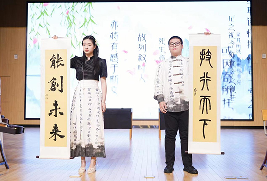 書法賽項2023年一等獎獲得者黃婧怡、2020年一等獎獲得者高家昊與鄞州職教中心古箏隊的同學(xué)們聯(lián)袂展示了《琴書合鳴話技能》。