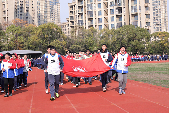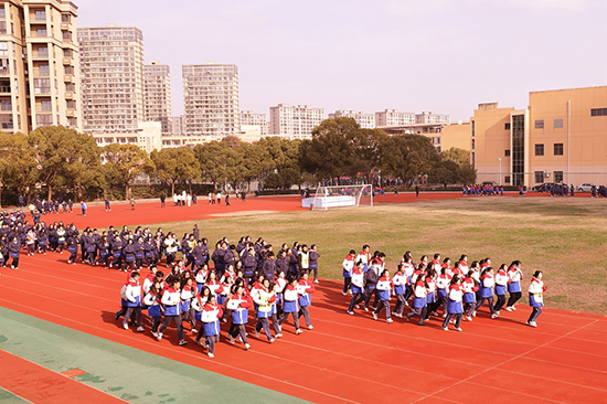 頂著寒風(fēng),四名校田徑隊員守護著校旗,步調(diào)一致地跑在跑道中央,全校79個班級組成的79個方陣由班主任帶隊一起慢跑前進(jìn),體育分管校長則領(lǐng)跑在前。因為班級數(shù)量較多,全校各班分成田徑場、籃球場、行政樓大花壇周邊三個區(qū)域同時展開跑步,跑步的距離是1200米。幾圈跑下來,同學(xué)們感到渾身暖和,倍感舒適,個別同學(xué)雖然氣喘吁吁、累得幾度想放棄,但還是在老師的鼓勵下堅持跑完全程。