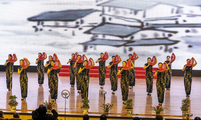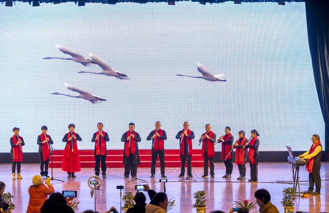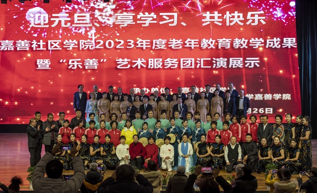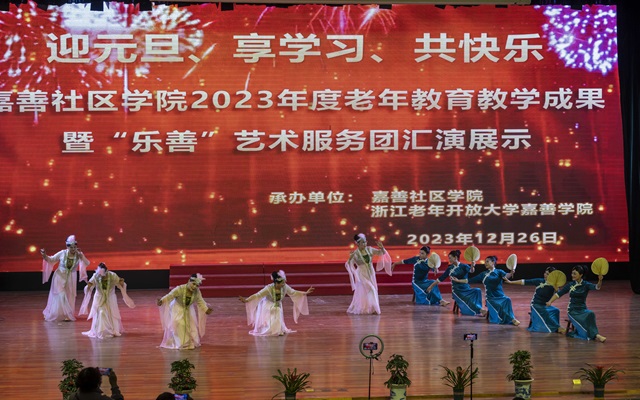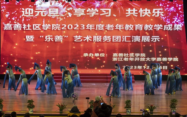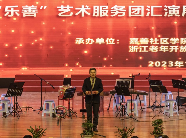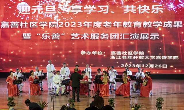 12月26日下午,在喜氣洋洋的民樂合奏《金蛇狂舞》中,嘉善社區學院2023年度老年教育教學成果暨“樂善”藝術服務團匯演展示在高級中學文體禮堂正式拉開帷幕。