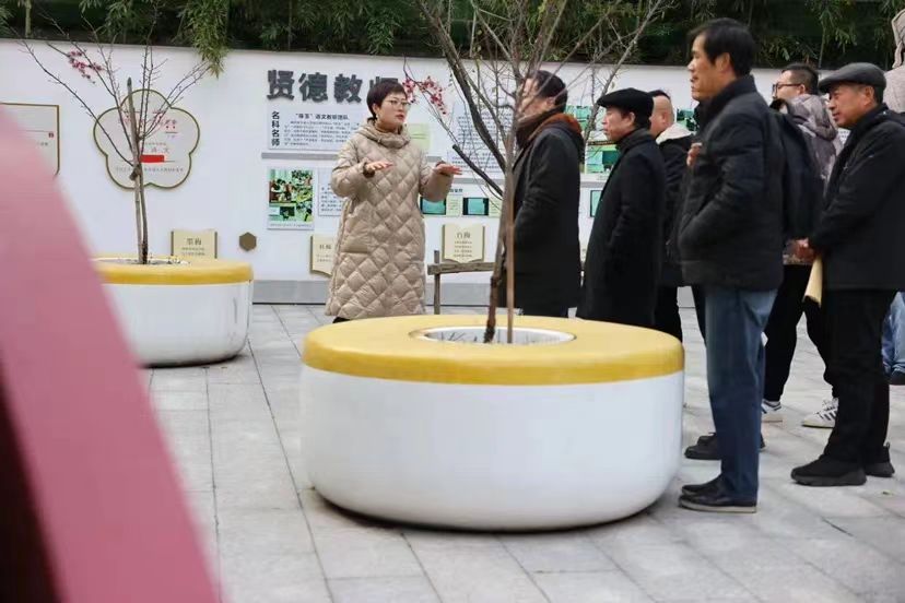 楓江書畫社成員在趙娜的引領下參觀校園。走到校訓碑前,聆聽“見賢思齊”校訓碑的來歷;來到黨建文化廣場,了解楓橋鎮王冕小學的校史及“賢和校園、賢德教師、賢才學生”的辦學目標;走進三賢文化廣場,感受“楓橋三賢”的人物事跡;移步到書畫陳列室,這里展示著學校獲得的各級各類的榮譽及40年來學子們的書畫作品。楓江書畫社成員在此駐足良久,翻看著學子們的作品及影集,濃郁的書畫教育氛圍打動了在場的每一位書畫愛好者。
