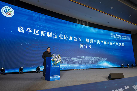儀式現場,臨平區新制造業協會會長、杭州西奧電梯有限公司總裁周俊良宣讀產業聯盟成員名單及產業學院成立文件。
