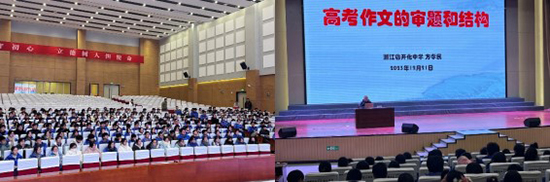 下午,方孝民老師在千人報告廳為全體高三學生帶來了一場關于“高考作文的審題和結構”的講座。從審題到結構布局,方老師以實例為高三學生“做一點調整”,再以一個“支架”,總結出“一元”“二元”“三元”的作文結構,培養學生的寫作思辨意識。
