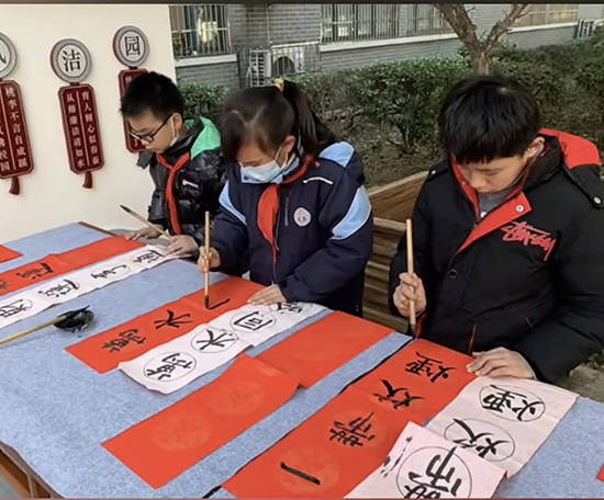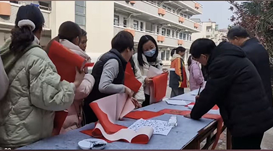 三賢廣場上,擺起一張張書法桌,一幅幅筆墨俱全,一條條紅色條幅鋪著。師生們一見這架勢,紛紛從辦公室、教室走出來,聚集到廣場中來。書法家們見師生們都圍聚過來,立馬鋪開紅紙,拿起毛筆,飽蘸濃墨,凝神靜氣,龍飛鳳舞起來,不一會兒,不同字體、風格迥異的“福”字跳躍在紙上,有剛勁雋永的,有端莊大氣的,有靈活舒展的,有清新秀麗的……字到、福到,意義深遠,飽含對新年的期盼和祝福。“龍騰華夏國興盛 福降神州民壽康”“龍騰盛世千家喜 春滿神州萬物榮”等對聯躍然筆下,大多歌頌繁榮富強的祖國,頌揚美好幸福的生活,讓圍觀的師生驚喜不斷;師生們見到自己心儀的“福”字與春聯,不待墨干就爭搶在手里,樂滋滋地保存起來。