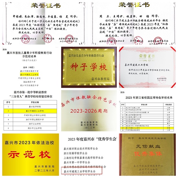 回望來時路,滿心皆澎湃。2023年,嘉興市建筑工業學校德育條線所有相關處室在“雙高”建設子項目“三全四融五步,提升人才培養水平”的建設引領下,緊緊圍繞工作計劃,始終堅持將立德樹人作為根本任務,將“常規工作上臺階,重點工作謀突破”作為基本工作原則,開展了包括育人隊伍建設、學生思想教育以及主題活動引領等一系列工作并取得驕人成果: