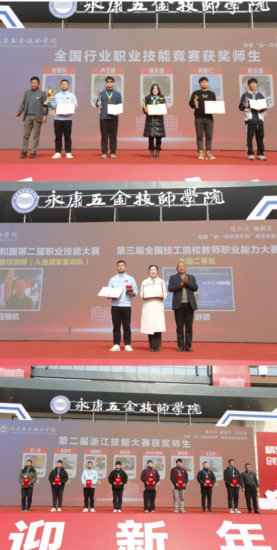 近年來,學(xué)校堅持大賽引領(lǐng),積極錨定對接世界技能大賽、國家職業(yè)技能大賽、教師職業(yè)能力大賽等賽事,精心組織各級各類技能大賽的參賽、承賽工作,營造崇尚技能氛圍,實現(xiàn)以賽促學(xué)、以賽促練、以賽促教。大會對2023全國技能大賽獲獎師生進(jìn)行了表彰,校黨委委員田雪萌、胡贊、馬林剛等領(lǐng)導(dǎo)分別為行業(yè)國賽獲獎選手、省政府獎學(xué)金獲得者、浙江省第二屆技能大賽獲獎?wù)摺⑷脒x國家隊選手、教學(xué)能力大賽國賽二等獎選手頒獎。曹法余書記、永康市人力社保局黨組成員盧慧紅為第47屆世界技能大賽中國集訓(xùn)基地揭牌。