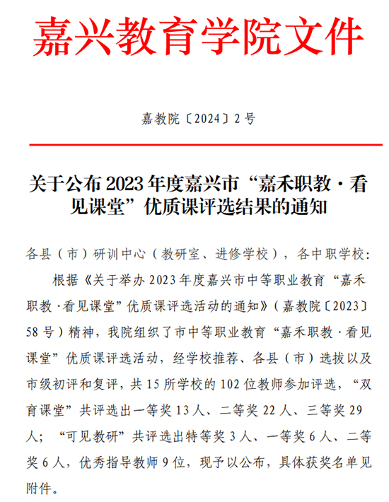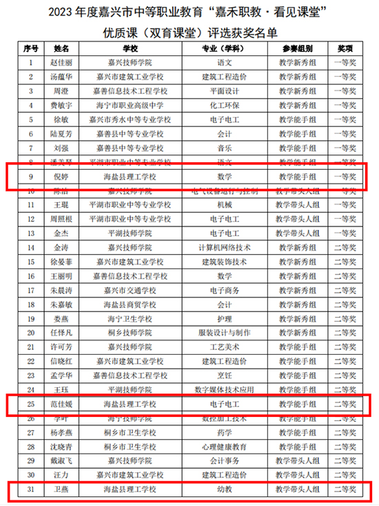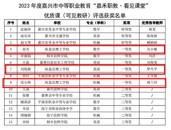 1月4日,嘉興教育學院公布了2023年度嘉興市“嘉禾職教·看見課堂”優質課評選結果。海鹽縣理工學校推送的6位教師均取得了優異成績。其中,倪婷老師獲“雙育課堂”一等獎,范佳媛、衛燕兩位老師獲二等獎;孫芳、劉俊源、范小偉三位老師均獲“可見教研”一等獎。