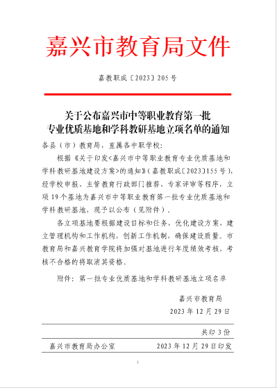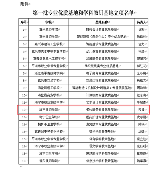 舊朝歲月隨風逝,新載希望翹首來。2023年12月末,根據嘉興教育局文件嘉教職成〔2023〕205號《關于公布嘉興市中等職業教育第一批專業優質基地和學科教研基地立項名單的通知》,海寧技師學院烹飪專業立項嘉興市中職學校第一批“專業優質基地”,不僅成為學院唯一一個立項“專業優質基地”的專業,也是嘉興市中職學校烹飪專業中唯一一個立項的學校。