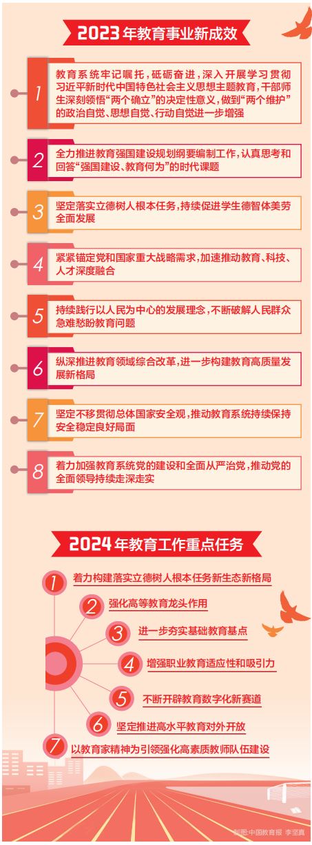 會議指出,剛剛過去的2023年,是全面貫徹黨的二十大精神的開局之年,是實施“十四五”規劃承上啟下的關鍵一年,也是三年新冠疫情防控轉段后經濟恢復發展的一年。一年來,在習近平總書記親自關心、親自部署、親自推動下,教育系統牢記囑托,砥礪奮進,深入開展學習貫徹習近平新時代中國特色社會主義思想主題教育,干部師生深刻領悟“兩個確立”的決定性意義、做到“兩個維護”的政治自覺、思想自覺、行動自覺進一步增強;全力推進教育強國建設規劃綱要編制工作,認真思考和回答“強國建設、教育何為”的時代課題;堅定落實立德樹人根本任務,持續促進學生德智體美勞全面發展;緊緊錨定黨和國家重大戰略需求,加速推動教育、科技、人才深度融合;持續踐行以人民為中心的發展理念,不斷破解人民群眾急難愁盼教育問題;縱深推進教育領域綜合改革,進一步構建教育高質量發展新格局;堅定不移貫徹總體國家安全觀,推動教育系統持續保持安全穩定良好局面;著力加強教育系統黨的建設和全面從嚴治黨,推動黨的全面領導持續走深走實。一年來,教育系統始終堅持從政治上看教育、從民生上抓教育、從規律上辦教育,推動教育事業取得新突破,教育高質量發展打開新局面,為黨和國家工作大局作出了新的貢獻。