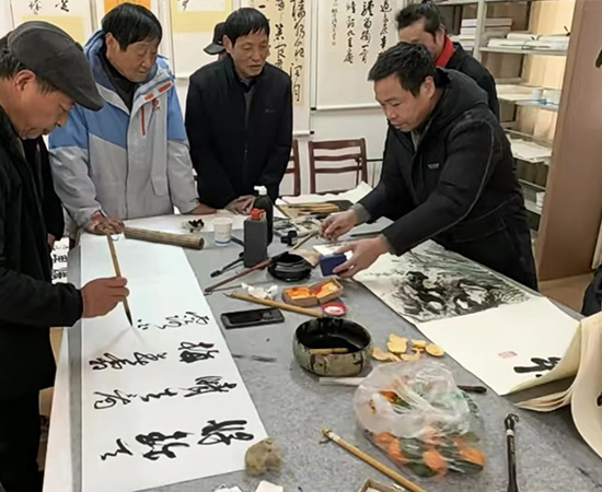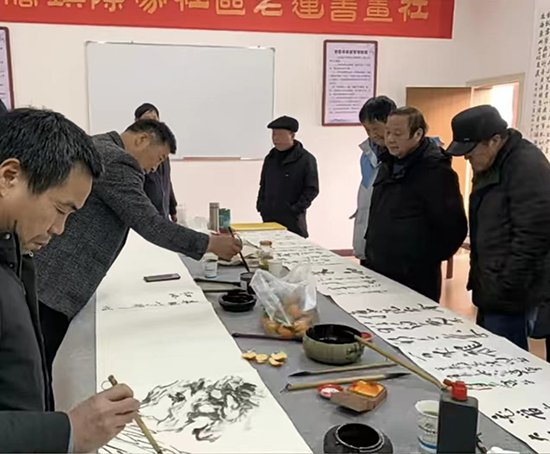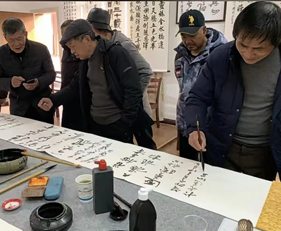書畫社部分成員在社長魏仁虎的帶領下走進教室,紛紛鋪開宣紙,凝神定氣、在不同規格的宣紙上龍飛鳳舞,不一會兒,在對開、橫開、條幅、橫批、立軸上出現了一條條、一幅幅、一對對吉祥如意、國富民泰的詞句,斗方中則出現了不同字體的“福”字和四字祝福語。魏仁虎在條幅上寫下了“盡得其樂”四個蒼遒有力的大字。社員們寫好后,互相品評鑒賞,從書寫、字形、筆勢、布局指出好處與不足,坦誠相待,其樂融融。隨后,在魏仁虎的提議下,在場社員在長卷中合作創作書畫合璧的作品,擅長繪畫的駱江山畫下恢弘氣勢的山水畫;有的橫寫四字大字;有的豎寫小楷詩句。每人字體、字形、大小不一,筆走龍飛,布局合理。