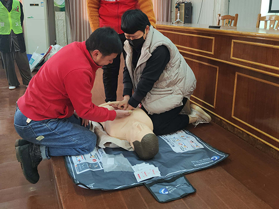 “我來試試!”“你這個手一定要伸直,節奏可以再慢點。”王華峰老師手把手地指點著,牢抓細節,一一糾正,確保大家能更精準地掌握正確的急救知識要領。現場氣氛活躍,大家不分年齡,不論身份,懷著相同的目的認真練習。