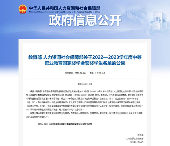 2023年12月末,教育部、人力資源和社會保障部發布了《2022—2023學年度中等職業教育國家獎學金獲獎學生名單》的公告,海寧技師學院5名學生獲得中職國家獎學金,截止目前海寧技師學院已共有25名學子獲得本項國家級殊榮。