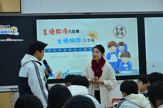 在18日上午的班會課展示環(huán)節(jié),衢州第二中專的吳思老師以“言語欺凌風寒,文明相伴三冬暖”為主題,引導學生認識到文明用語的重要性。衢州工商學校的李爾老師展示了題為“低碳生活,從一度電開始”的班會課,引導學生實踐節(jié)能減排。