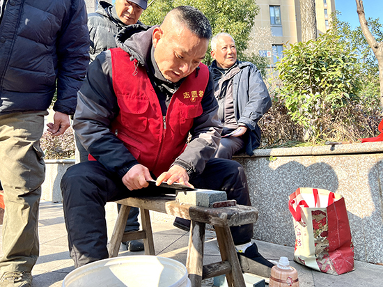 “春滿人間民泰安 龍騰云海國昌盛”來自太湖街道成校的書法老師揮毫潑墨,一幅幅墨香濃郁、寓意美好祝福的大紅春聯和喜慶“福”字及“龍”形字畫躍然紙上,讓前來領取春聯的居民喜笑顏開。“手寫春聯、福字是在用墨香傳遞傳統文化,這份‘新年禮物’何等珍貴,相比購買印刷的春聯、福字,手寫得更有人情味。”王阿姨手捧新鮮出爐的春聯開心地說。志愿服務廣場一側是城管、消防、公安、銀行在開展垃圾分類、文明養犬、燃氣安全、禁止燃放煙花爆竹、反詐等宣傳,他們向前來的居民們發放單頁,進行現場普及、講解;另一側則是愛心商戶們支起的市集攤位,骨科義診、口腔義診、量血壓、測血糖等形式進行衛生健康科普宣傳,倡導廣大居民主動學習健康知識,掌握健康技能,踐行文明健康的生活方式,積極營造“全民健康、人人參與”的良好社會氛圍;與此同時還有義剪、磨剪刀等便民服務,吸引了一眾居民前來參與,場面熱火朝天。