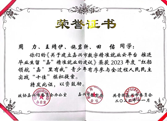 2023年以來(lái),學(xué)校在推進(jìn)青少年民主實(shí)踐過(guò)程中,建立起了由學(xué)生干部、團(tuán)員青年為主要成員的學(xué)生民主實(shí)踐社團(tuán)1個(gè),校企共建德育實(shí)踐基地3個(gè),開(kāi)展了涉及食品安全、養(yǎng)老服務(wù)、招生就業(yè)等主題在內(nèi)的專題調(diào)研、專題協(xié)商、民主監(jiān)督活動(dòng)10余次,參與學(xué)生1500余人次。學(xué)校選送的《關(guān)于建立嘉興市數(shù)字精準(zhǔn)就業(yè)云平臺(tái)推進(jìn)畢業(yè)生留“嘉”精準(zhǔn)就業(yè)的建議》《關(guān)于進(jìn)一步優(yōu)化社區(qū)老年食堂建設(shè)的提案》兩個(gè)提案,在“紅船領(lǐng)航‘嘉’里有我”青少年學(xué)生優(yōu)秀模擬提案評(píng)選中獲評(píng)市級(jí)“十佳”模擬提案。