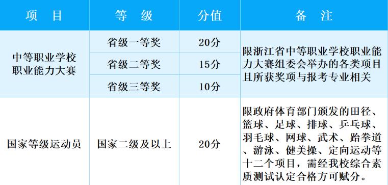 以上賦分為個(gè)人項(xiàng)目,其他所有團(tuán)體項(xiàng)目成員按個(gè)人項(xiàng)目分值的50%計(jì)分??忌煌惇?jiǎng)項(xiàng)可累計(jì)賦分,但賦分最高分值累計(jì)不超過20分。素質(zhì)特長項(xiàng)目賦分需經(jīng)相關(guān)部門認(rèn)定,學(xué)校招生領(lǐng)導(dǎo)小組審核后有效。