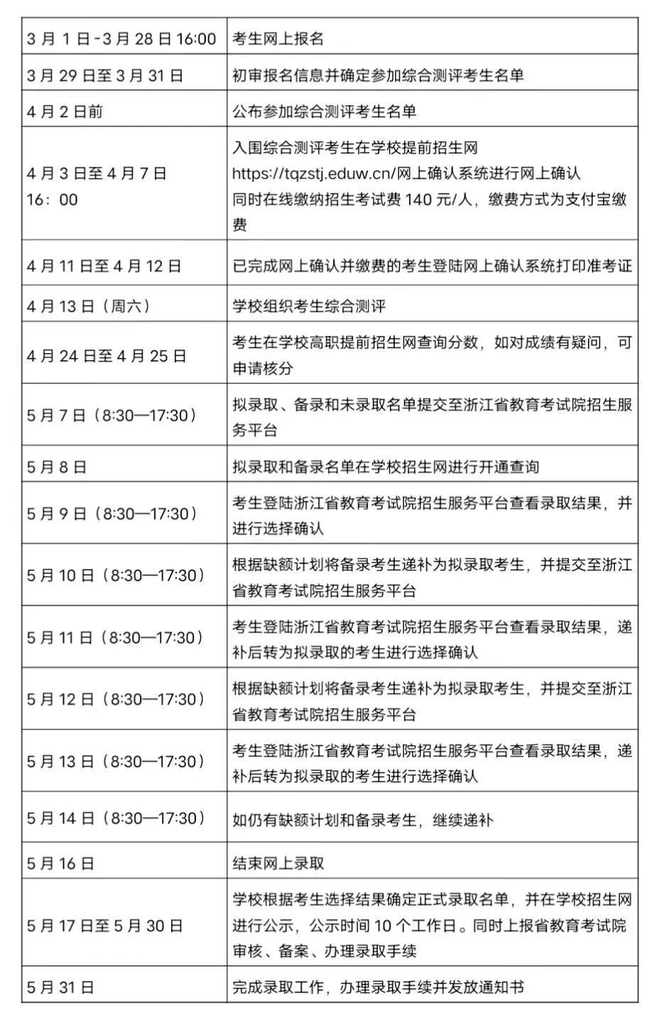 (一)報名凡符合我校高職提前招生報名條件的考生于3月1日-3月28日16:00通過學校提前招生網(https://tqzstj.eduw.cn/)登錄,或直接登錄浙江省教育考試院高職提前招生服務平臺提交報名信息。