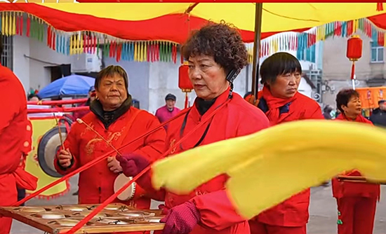 巡演隊(duì)伍早早地聚集在楓橋鎮(zhèn)陳家社區(qū)的敦倫堂廣場(chǎng)。時(shí)間一到,楓橋鎮(zhèn)陳家社區(qū)黨總支書(shū)記陳樂(lè)琴宣布“‘陳家十番’巡演開(kāi)始!”鞭炮鳴放,鑼鼓喧鬧,一條長(zhǎng)約200米左右、寬2米的大番被人抬起,番中間是大幅的黃色面料、兩側(cè)點(diǎn)綴著紅黃藍(lán)相間的流蘇,遠(yuǎn)看似一頭奔跑的獅子,形似獅頭的周邊用大紅花裝飾、正上方鑲嵌著一個(gè)圓形用金黃絲線滾邊、金鳳與祥龍托著的繁體篆書(shū)“陳”字,下方書(shū)寫(xiě)著紅底黃色繁體的“楓橋陳家十番(文藝)隊(duì)”幾個(gè)大字,長(zhǎng)番下穿插著手持各種吹打樂(lè)器和抬番人員60人左右。一路鼓磬齊鳴,充滿(mǎn)著歷史的鄉(xiāng)愁和時(shí)光的旋卷,天樂(lè)流音,輕輕地飄逸,繞梁回蕩;笙簫琴笛、輕鑼木魚(yú)、響板合奏,恰似天籟之音,仙樂(lè)飄飄。巡演路上,莊重喜樂(lè)的氛圍,箏笙簧管弦,宮商角徵羽,鑼鼓響,鐃鈸擊,魚(yú)磬敲,蘆笙吹,應(yīng)有盡有。街坊路人絡(luò)繹不絕放緩或停下來(lái)好奇地觀看,陶醉在華彩四射、輕風(fēng)漫飄、音調(diào)古樸的江南絲竹之音中。