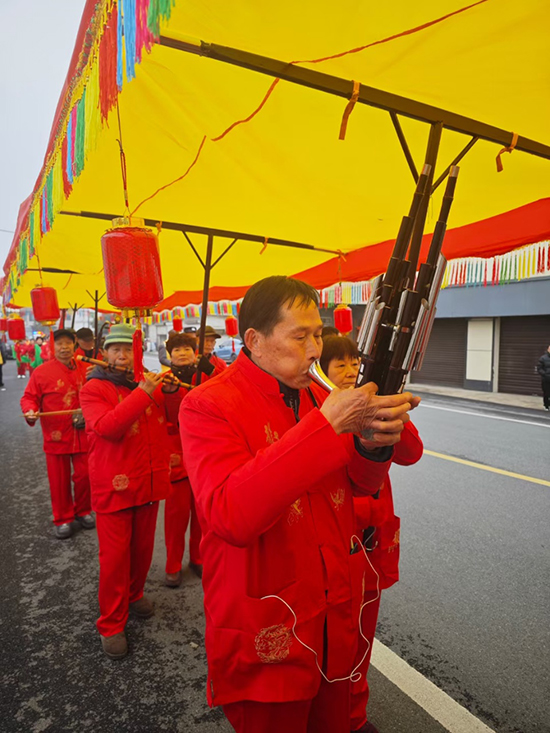 2月27日上午,諸暨市楓橋鎮(zhèn)陳家社區(qū)邊的楓山線上十分熱鬧,楓橋鎮(zhèn)陳家十番文藝隊(duì)正在進(jìn)行“陳家十番”巡演,隊(duì)員們身著喜慶的胸前繡有祥龍飛舞的紅色服裝、吹打著悠揚(yáng)悅耳的古樂(lè)曲,引得過(guò)往行人紛紛駐足,拍下珍貴的照片。