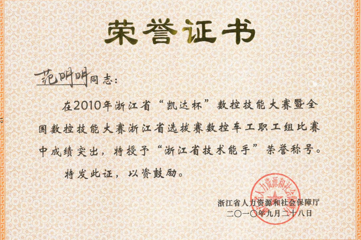 榮獲浙江省職工車工職業競賽二等獎、臺州市五一勞動獎章,臺州市技能大師、臺州市技術能手,臺州市技能競賽車工項目一等獎和數控車工項目二等獎。個人參與企業項目:減速機箱體多工位四面銑削技術的研發,蝸輪高效率全自動加工成型技術,齒輪內孔鉸珩工藝的研發,減速機傳動軸高精密全自動無心磨削技術的研發等,有效提高企業產品的加工效率和新產品的工裝夾具的制作。此外,他還是椒江區勞模工匠志愿服務月技能提升服務隊成員,積極參加各類社會培訓活動。