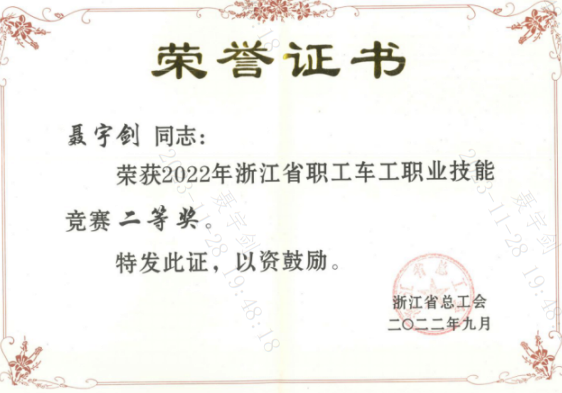 在中職學習期間,他多次代表學校參加數控技能大賽,取得優異成績。大學期間代表學校參加全國三維數字化創新設計大賽獲得“龍鼎獎”浙江賽區一等獎。工作期間勤勉精進,不斷提升個人專業素養和技能水平;團結同事、助力企業創新發展。曾斬獲2021年臺州市數控車職業技能競賽一等獎,并取得數控車工二級/技師職業資格證書;團結同事,努力實現車間現有刀具的更新與改善,提升車間生產20%效率,提升產品合格率20%;同時,他悉心指導、幫助同事實現技能等級提升,助力深化校企合作;發掘企業技能人才,成立技能大師工作室,幫助企業提升生產效能。