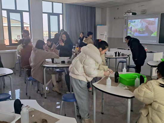 盆栽植物栽種活動開始,老師們領取了各類植物材料、簡單而不失美觀的花盆、細微的沙土等,都讓老師們躍躍欲試。盆栽老師先為大家講解了這些植物的養殖要點,包括澆水、溫度、日照等生活中常見的問題,并現場解析與示范如何正確種植。