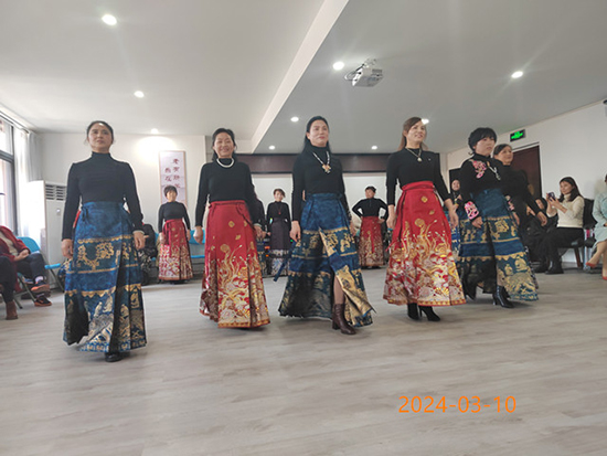 章老師首先向大家宣布了此學期的課程安排以及學習內(nèi)容,在開班儀式結(jié)束后,伴隨著一首首節(jié)奏輕快的音樂,章老師從拉伸關(guān)節(jié)的熱身操入手,逐步示范并指導學員們站姿、造型、走位等儀態(tài)技巧,部分學員展示了馬面裙的舞臺風采。現(xiàn)場歡聲笑語不斷,氛圍熱烈。