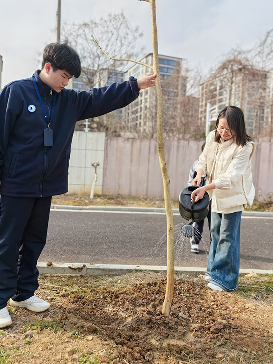 植樹現場,師生互相協作,配合默契。挖坑、培土、澆水。經過一番辛勤努力,一棵棵小樹苗在大家的精心呵護下挺立起來,煥發出勃勃生機。